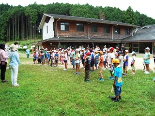 子どもたちが奈良市青少年野外活動センターの野外広場に集合し、入所式をしているところです。