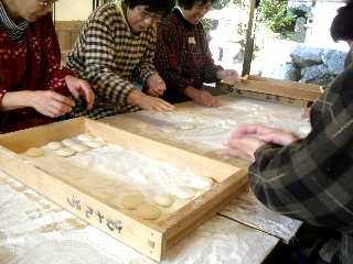 当番の方たちが、参拝者にふるまわれるダンゴ汁を準備している様子です。