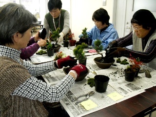 マツ、ナンテン、キク、コケ、植木鉢から土まで全部準備していただきました。