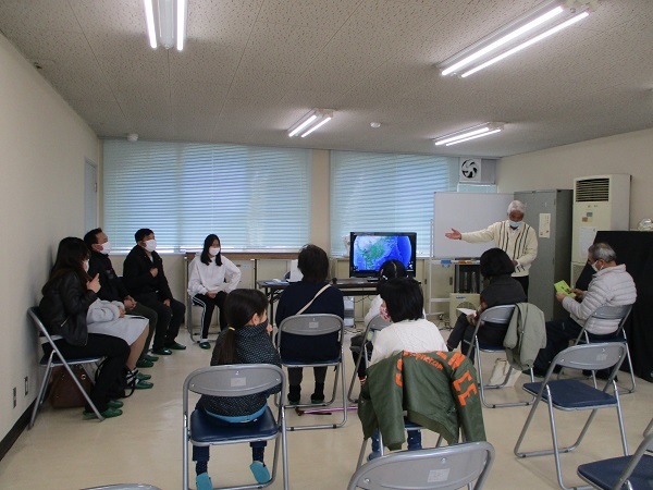 スライドを使って食べ物や習慣のお話をしてくださっています。