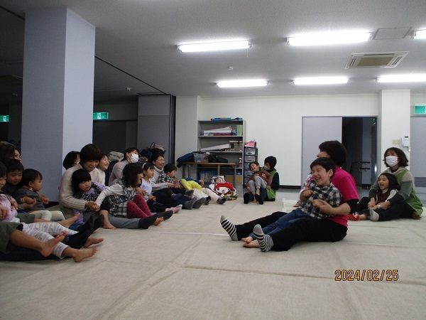 子どもたちは保護者の方の膝の上に乗ります。
