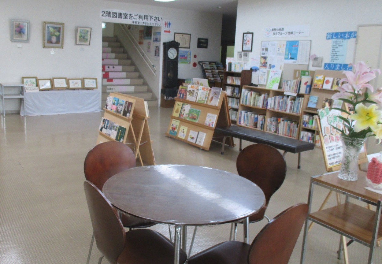 南部公民館のエントランスホールは、地域の皆さんの憩いの場となっていて、楽しそうな声が聞こえてきます。ここには貸出し図書(絵本も含めて)を配置していますので、学校帰りの小学生は自習をしたり、本を読んだり、またお友達との待ち合わせに利用したり活用してくれています。