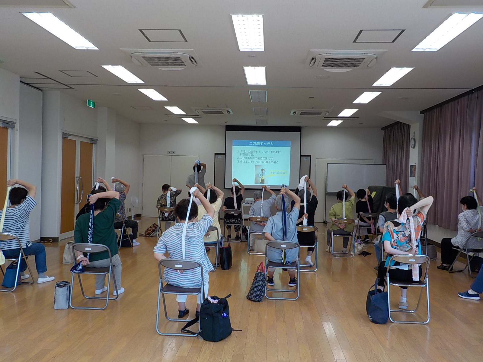 登美ヶ丘公民館では、筋力低下予防と引きこもり防止を兼ねて、月2回、「登美ヶ丘ひだまり体操」を実施しています。